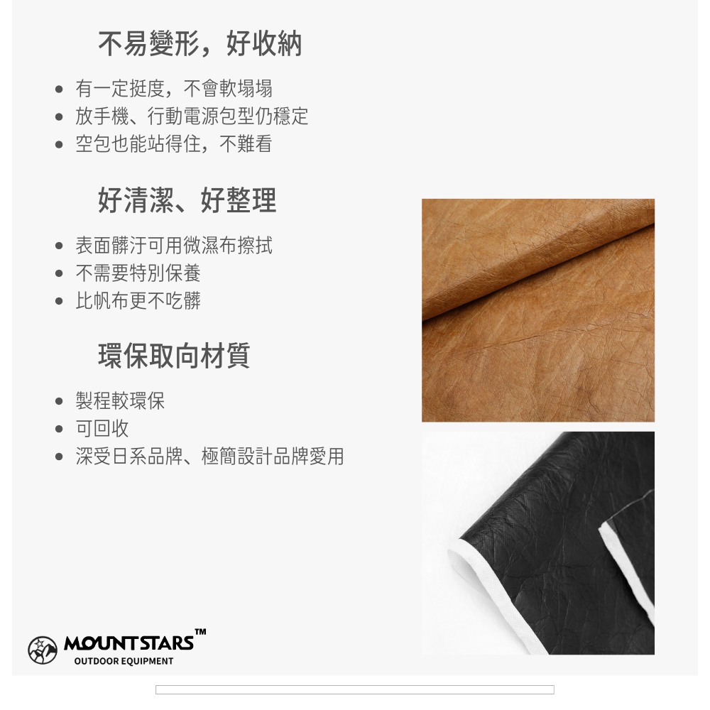 外觀看起來像紙,但實際上比紙耐用很多,常見於日系機能包、戶外小物、極簡風配件。