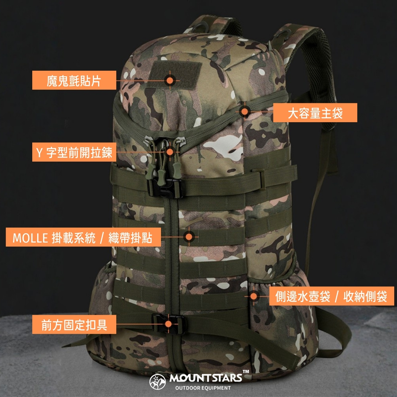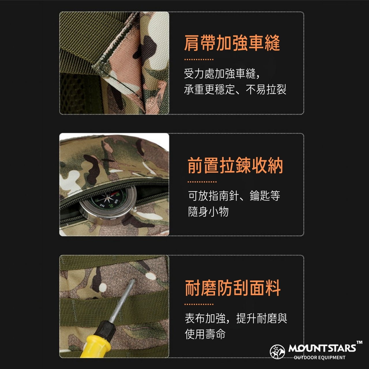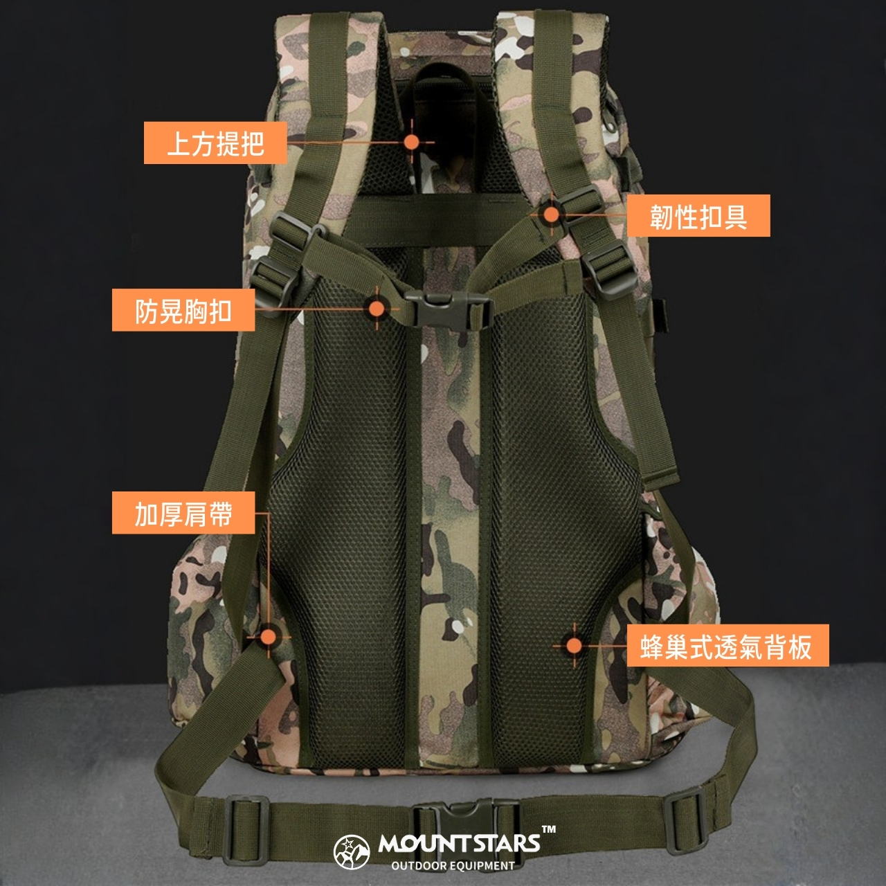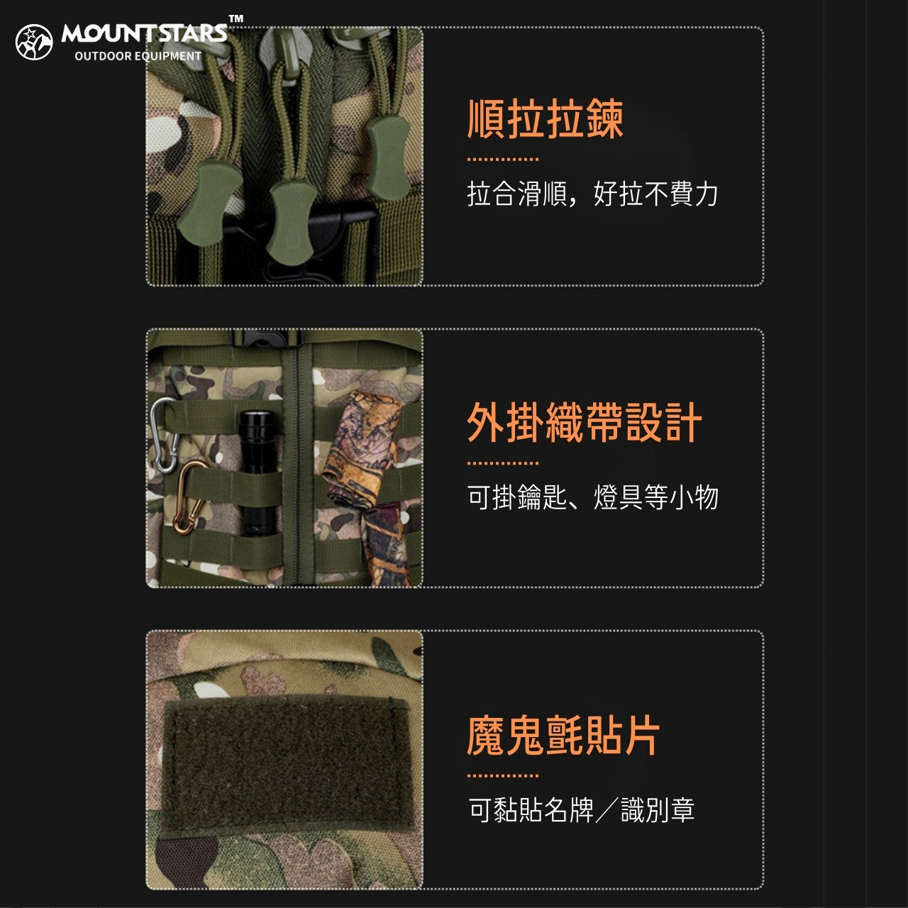 ✔戰術 MOLLE 織帶系統:可外掛水壺、燈具、工具