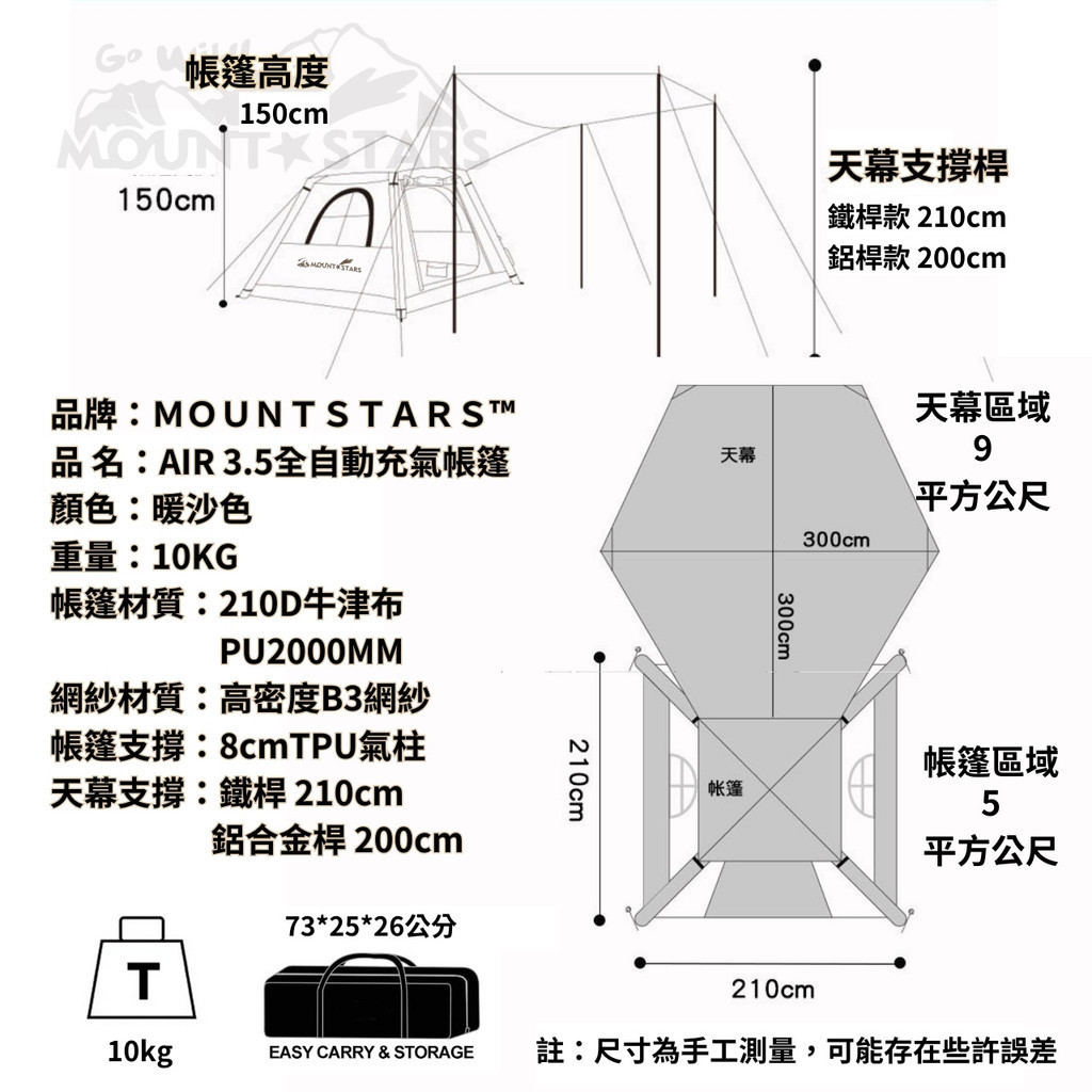 星攀戶外✩MTS(MOUNT-STARS™)充氣帳篷 3-4人帳篷 AIR 3.5 經典暖沙 新款天幕延伸組合 210cm三人大空間充氣帳 登山露營旅遊帳