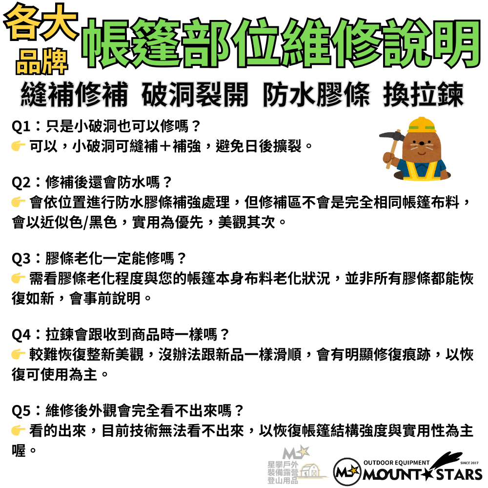 👉 會依位置進行防水膠條補強處理,但修補區不會是完全相同帳篷布料,會以近似色/黑色,實用為優先,美觀其次。