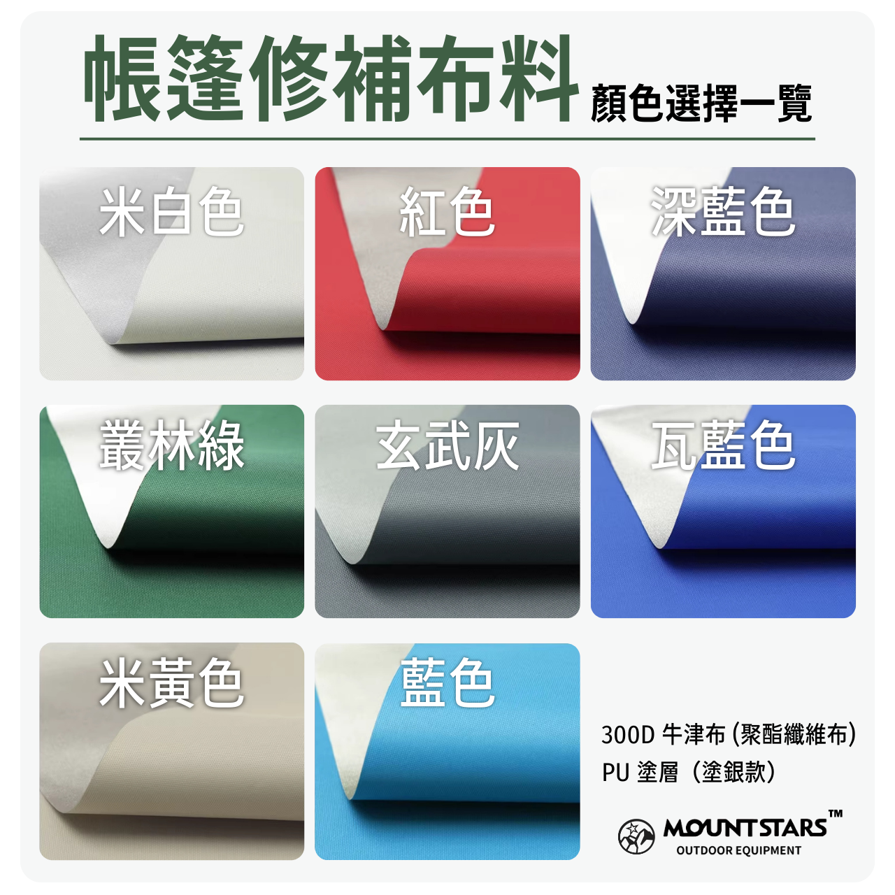 📌為了讓帳篷修補後外觀更接近原帳篷、整體看起來不突兀,我們提供多款常見帳篷修補布料顏色可選。